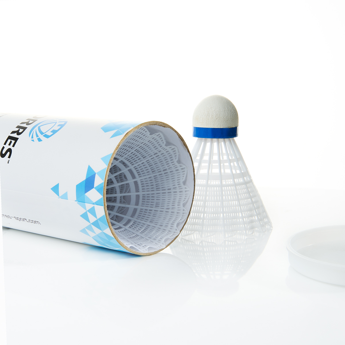 Волан TORRES 250, тренировочного уровня для игры в зале и на улице. Нейлоновая юбка белого цвета. Пробковая "головка" волана с индикаторной лентой синего цвета, что соответствует средней скорости, для игры при температуре от 12 до 23 °С. Высота волана 8 см, диаметр юбки 7 см.