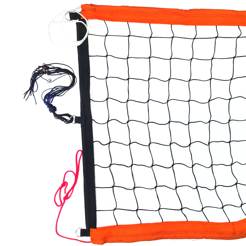 Верхние и нижние ограничительные ленты шириной 7,5 см из полиэстера оранжевого цвета, боковые ленты шириной 5 см из полиэстера черного цвета. Полотно сетки из специального светостабилизированного, водоотталкивающего пропилена черного цвета (толщина нити 3 мм, ячейка 10см*10см). Применение данных материалов позволяет использовать сетку на открытых площадках при игре в агрессивных погодных условиях (яркий свет, дождь, высокая влажность, низкая температура воздуха) без угрозы растяжения и провисания полотна сетки, и разрушения структуры материала. Для равномерного натяжения сетки предусмотрены по 3 полипропиленовых шнура с каждой стороны, а также в боковые ленты вставлены фибергласовые стрежни, за счет чего сетка выглядит ровно натянутой даже при недостаточном натяжении троса и боковых шнуров.