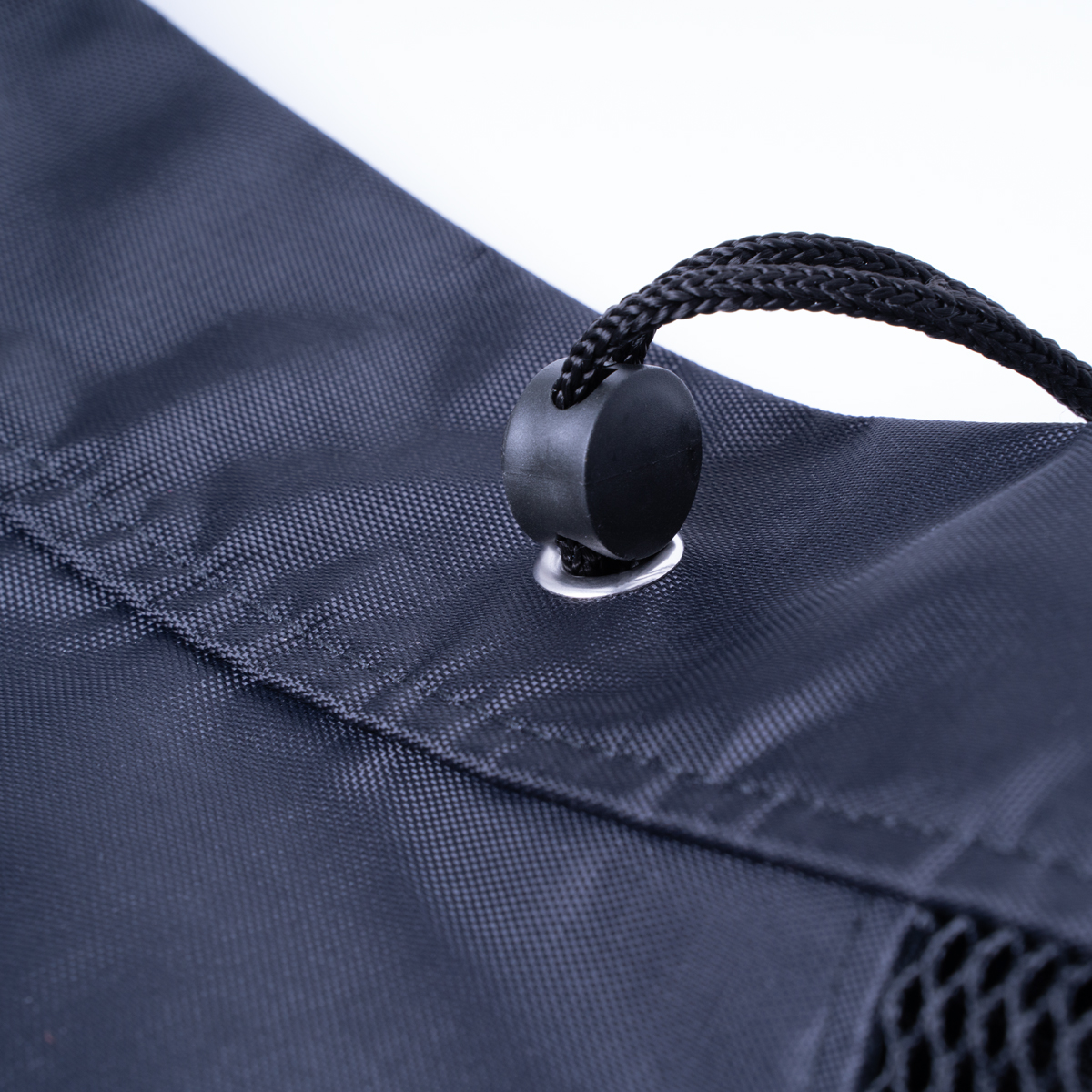 Сетка-mesh со вставками из плотного полиэстера, регулируемый ремень для переноски. Шнурок с фиксатором. Фирменный логотип.