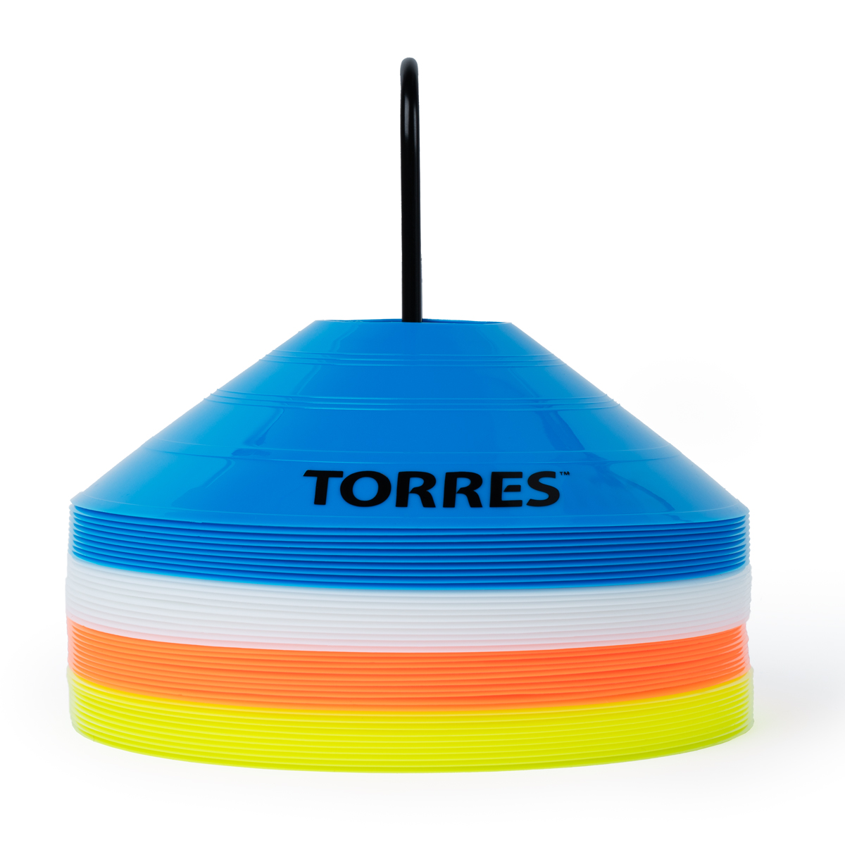 Фишки для разметки поля в виде усеченных конусов, мягкий пластик, комплект из 40 штук (синие, белые, оранжевые, желтые), высота 5 см, диаметр 19 см, на подставке без стопора.