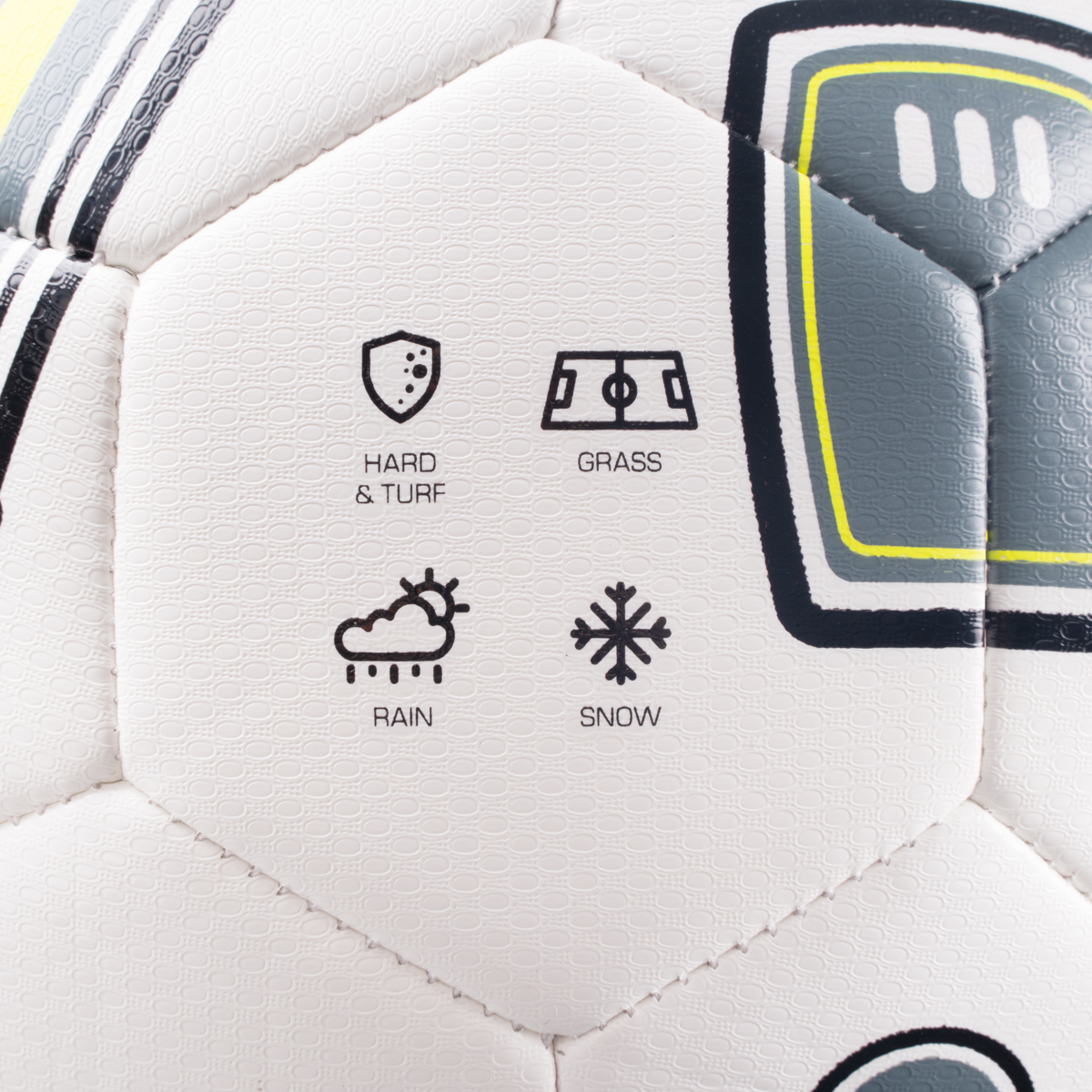 Матовая, мягкая синтетическая кожа (термополиуретан, состоящий из полиуретановой пены толщиной 4 мм, и защитной полиуретановой пленки толщиной 0,15 мм), подкладочный слой из пены и синтетической ткани, бутиловая камера, армированная 2 нитями нейлона и 1 нитью полиэстера. Машинная сшивка, 32 панели. Размер 3. Подходит для игры на любых поверхностях, но особенно рекомендуется для натуральных и искусственных газонов, полей с синтетическим покрытием различной степени жесткости. Подходит для игры в любых погодных условиях (при соблюдении условий эксплуатации и ухода). Рекомендуется для игр и тренировок в учебных учреждениях, для комплектации бюджетных госзаказов, а также для любительской игры.
