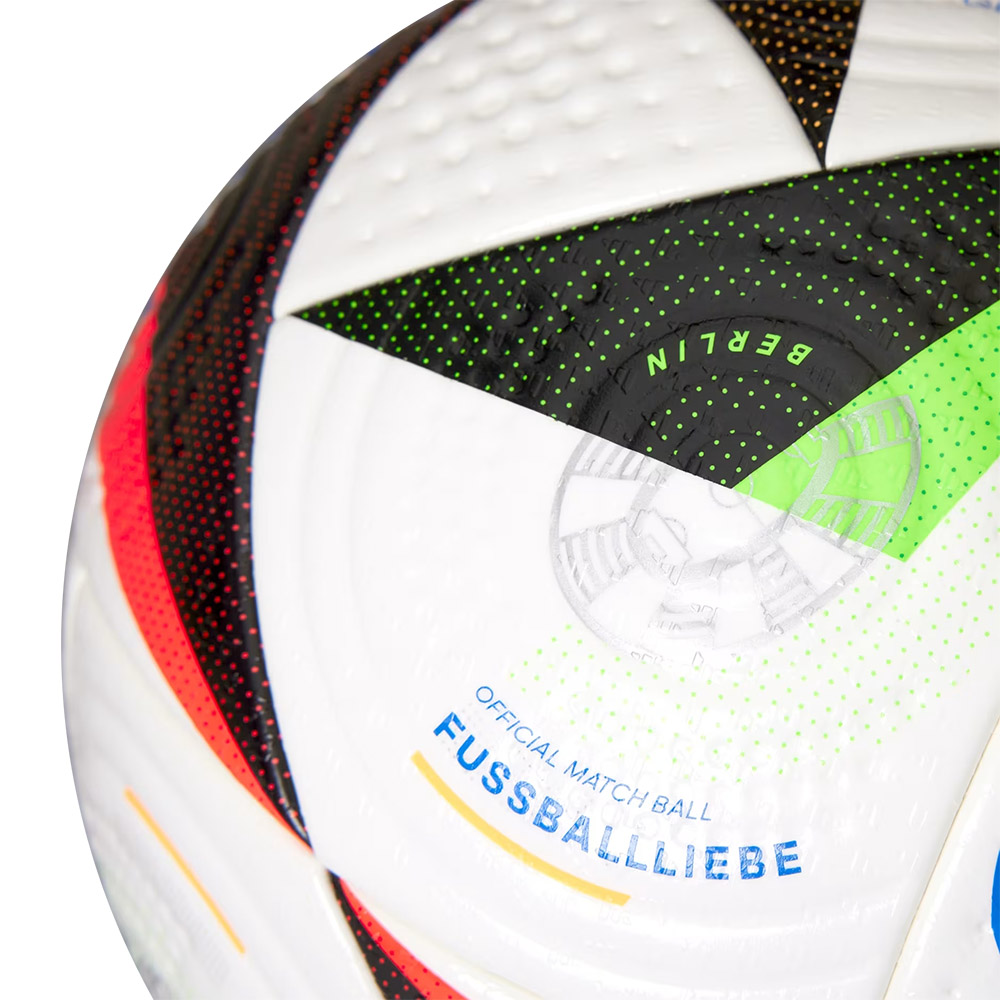 Смелый и красочный дизайн мяча ADIDAS Euro24 Fussballliebe PRO символизирует движение мяча и энергию игры с помощью рельефных рисунков в форме крыла, подчеркнутых яркими краями, изогнутыми линиями и точками. Рядом с названием каждого принимающего города на мяче нанесены изображения каждого из стадионов турнира