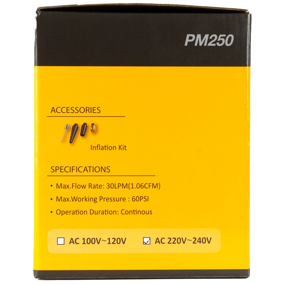 Оборудован мощным, прямоприводным двигателем. Потребляемая мощность 95 Вт, производительность 46,5 л/мин. Работает от сети 220-240В, 50/60 Гц. Максимальное время беспрерывной работы 2 часа, имеется встроенный предохранитель для защиты компрессора от перегрева.