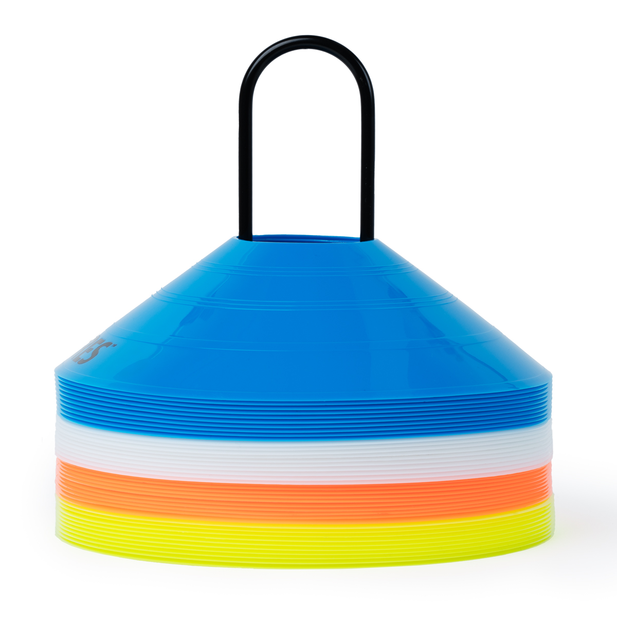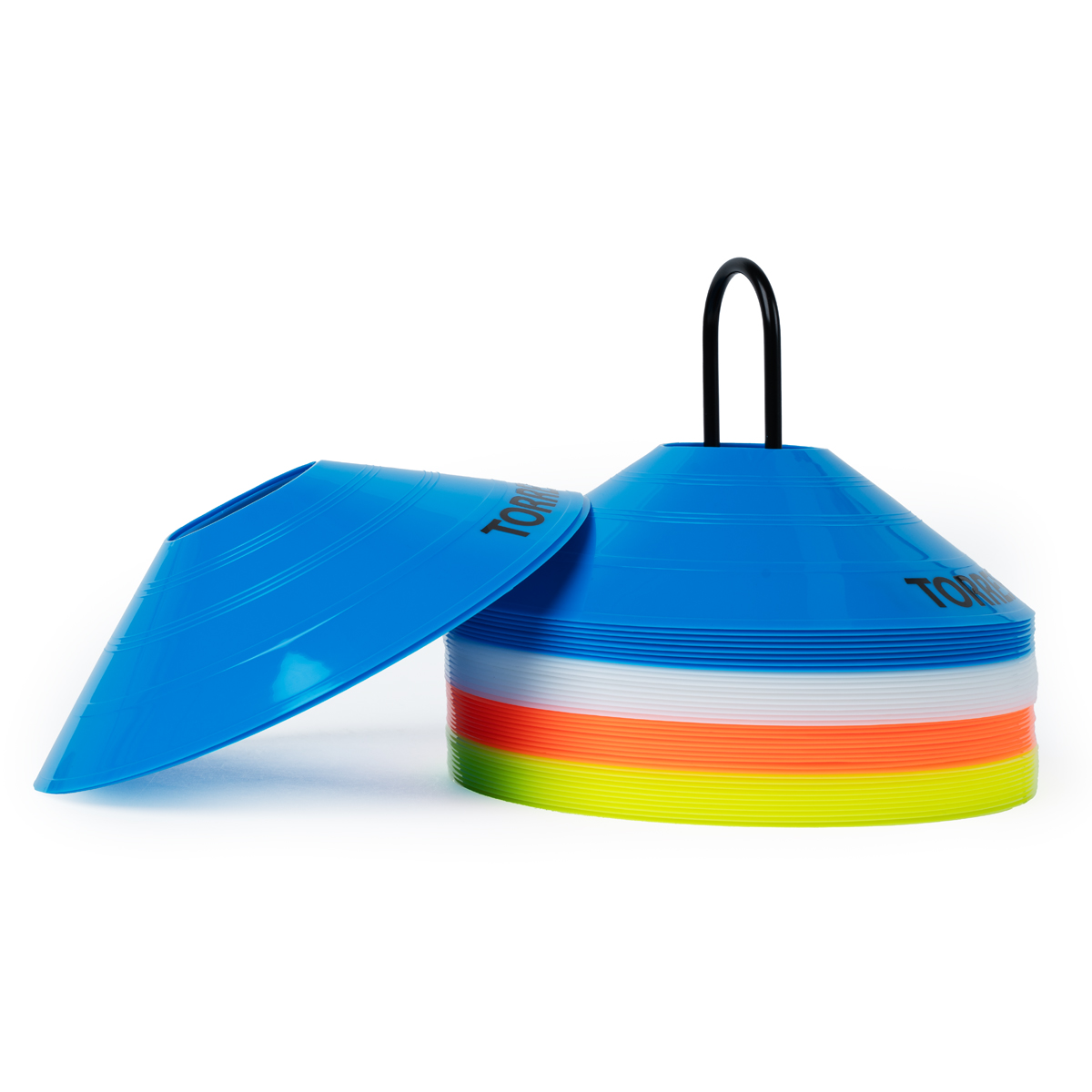 Фишки для разметки поля в виде усеченных конусов, мягкий пластик, комплект из 40 штук (синие, белые, оранжевые, желтые), высота 5 см, диаметр 19 см, на подставке без стопора.